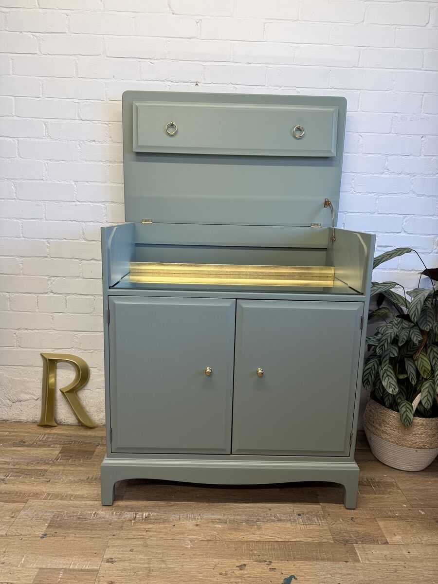 A beautifully restored Stag Minstrel drinks cabinet, professionally refinished in Card Room Green by Farrow & Ball—a soft, heritage green that brings a calm, timeless feel to the piece.