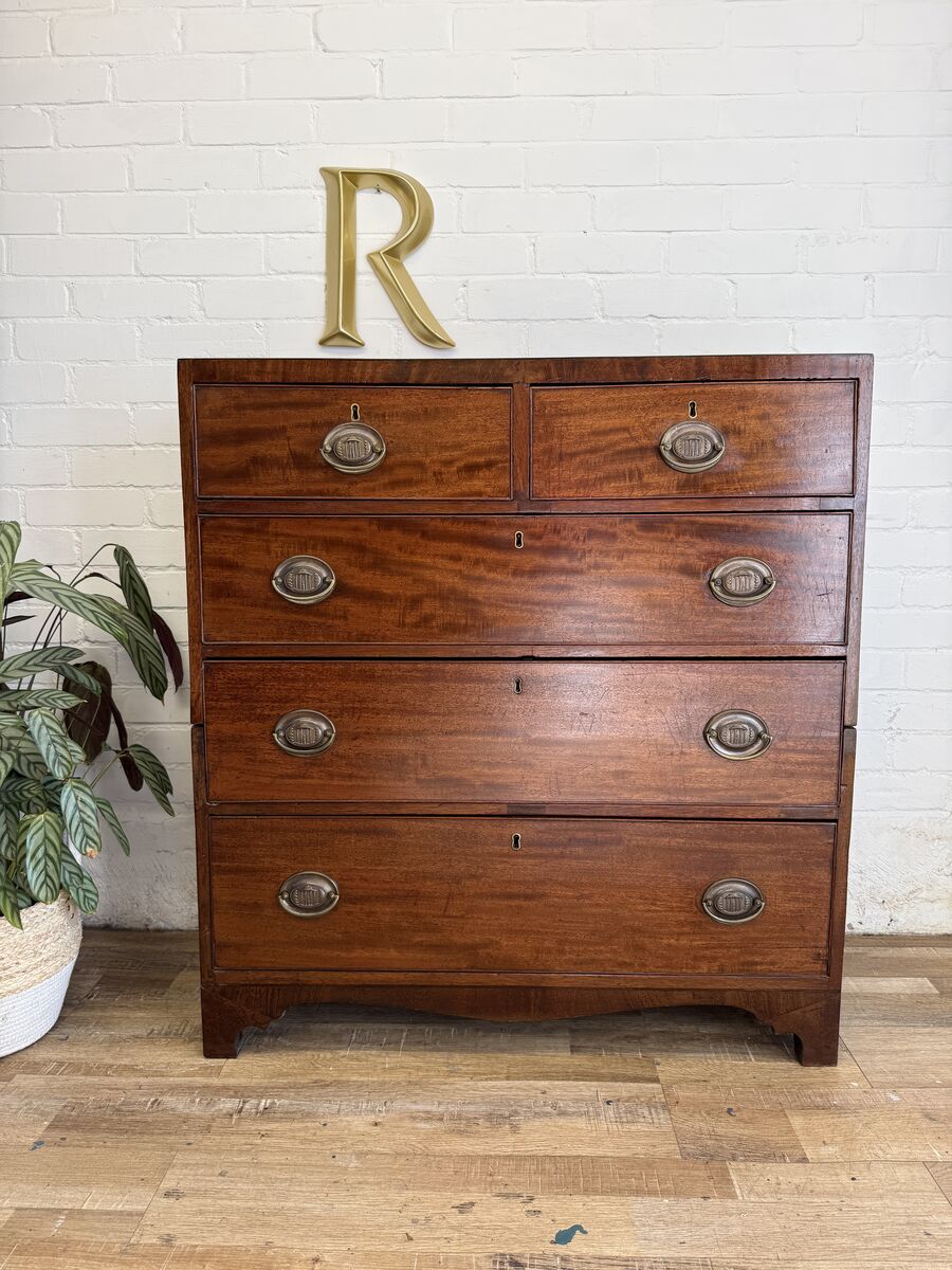 The layout comprises two short drawers above a series of graduated long drawers, offering generous and versatile storage. The original oval brass handles and escutcheons remain in place, complementing the rich mahogany beautifully, while the shaped bracket feet provide a subtle, refined finish.