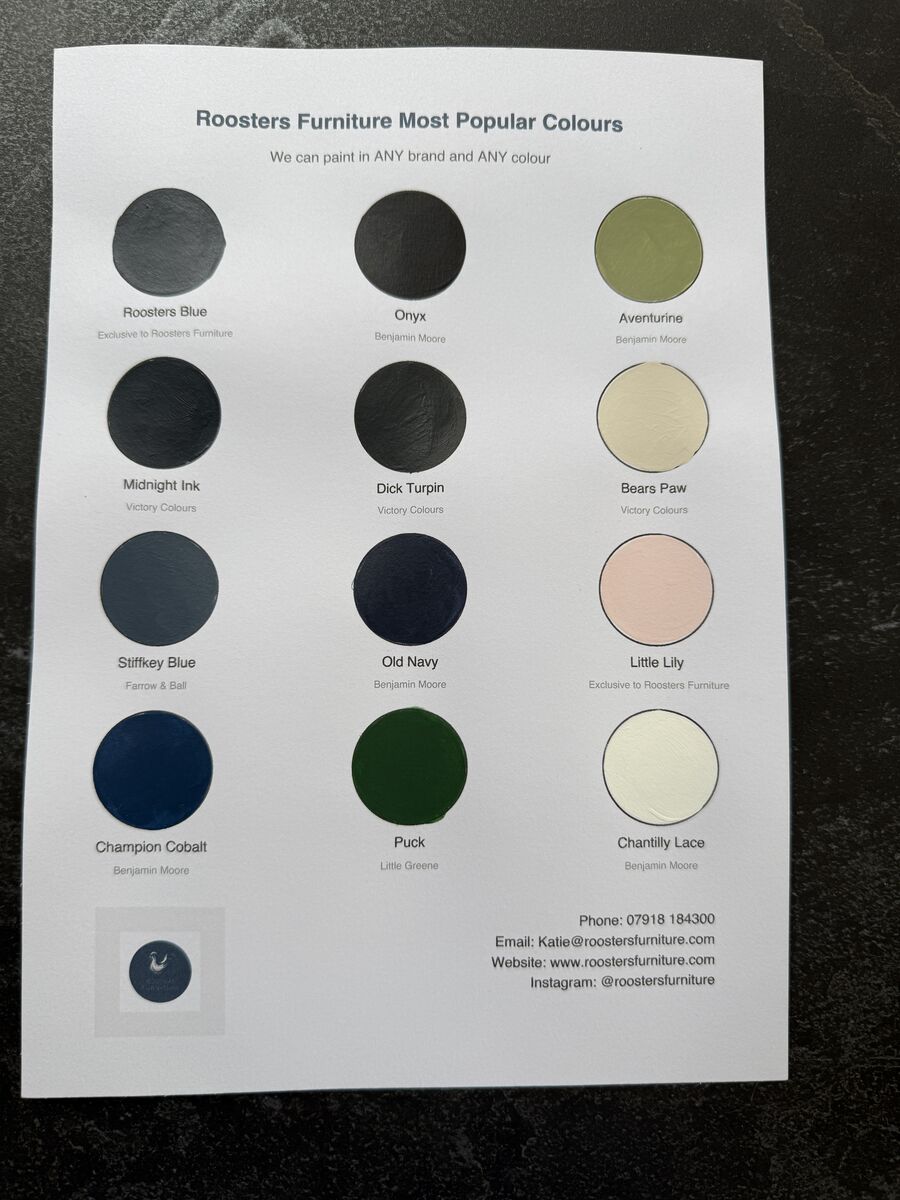 Please note- WE WILL PAINT OUR PAINTED TO ORDER ITEMS IN ANY COLOUR IN ANY BRAND please email katie@roostersfurniture.com for further details.