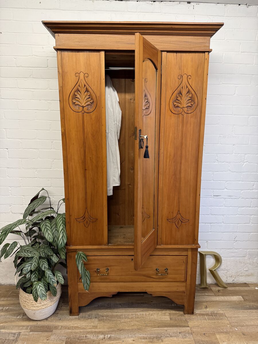 A beautifully detailed antique pine wardrobe featuring elegant carved panels with subtle Art Nouveau influence and a central mirrored door.